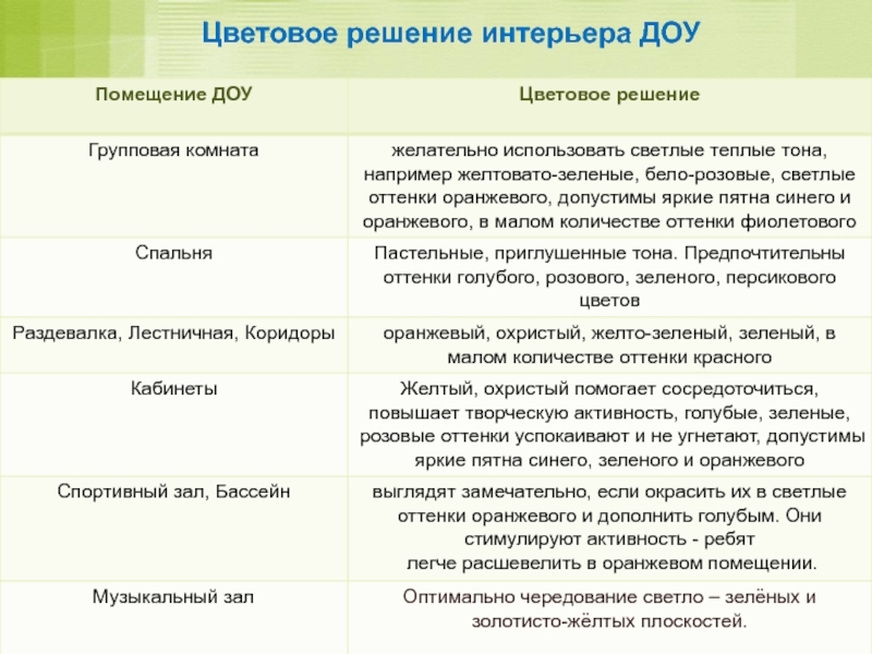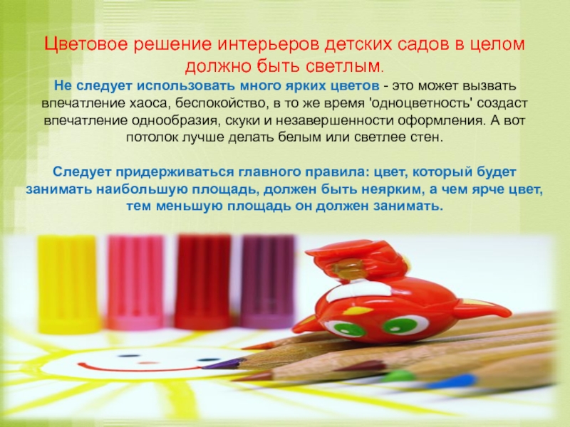 Цветовое решение интерьеров детских садов в целом должно быть светлым.