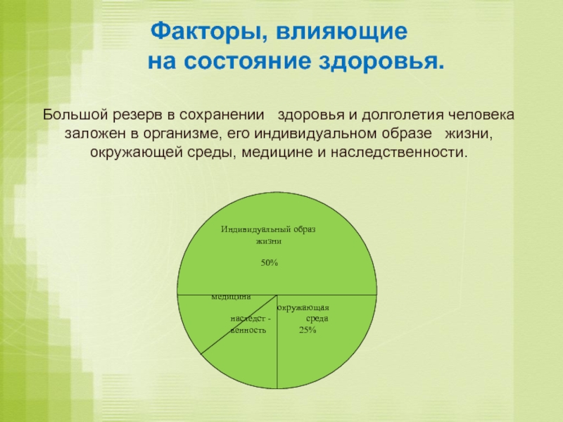 здоровья и долголетия человека заложен в организме, его индивидуальном образе жизни, окружающей среды, медицине и наследственности.