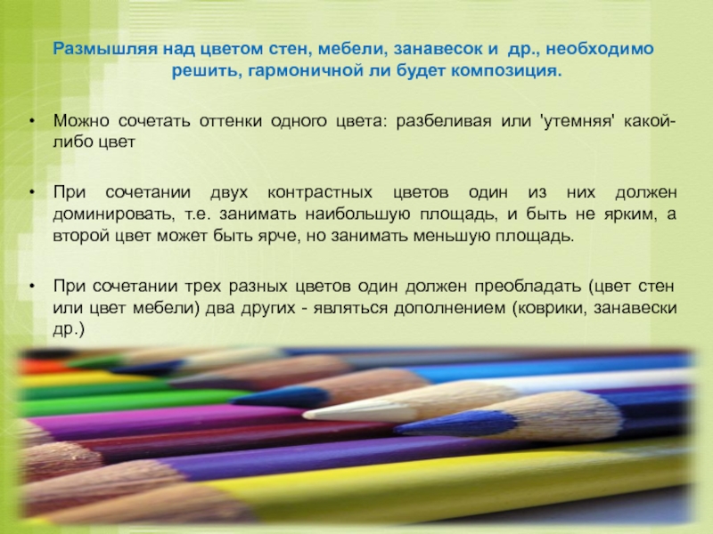Размышляя над цветом стен, мебели, занавесок и др., необходимо решить, гармоничной