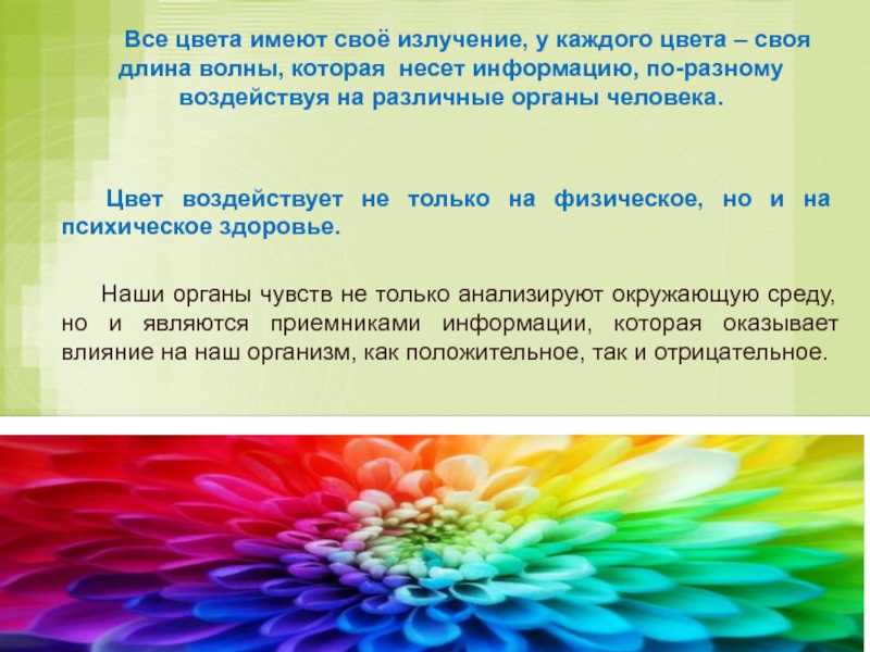 Цвет воздействует не только на физическое, но и на психическое здоровье.