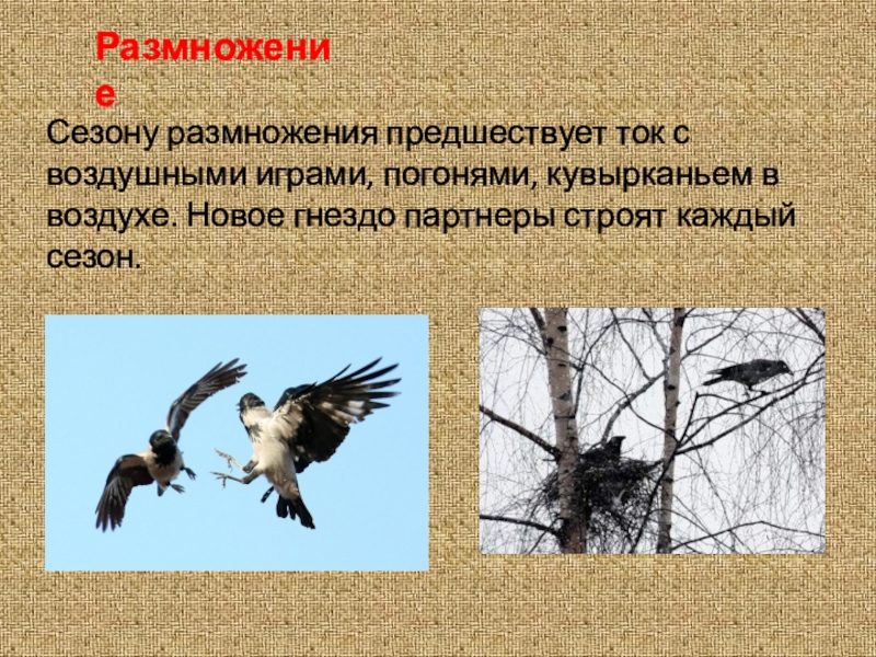 Слайд 14Серая ворона начинает гнездиться в марте-апреле . Гнезда устраивают в парках
