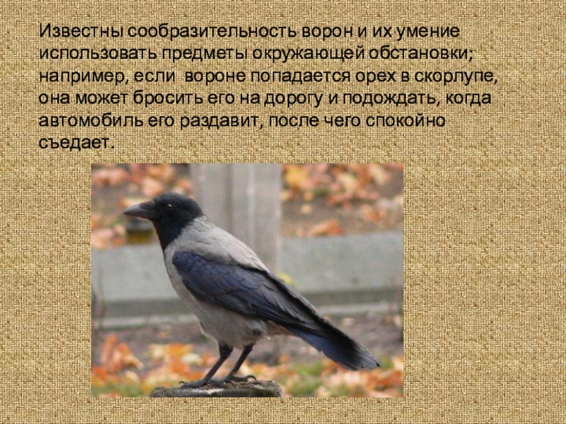 Слайд 19Известны сообразительность ворон и их умение использовать предметы окружающей обстановки; например,