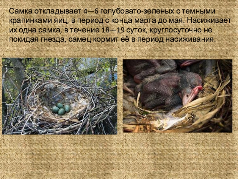 Слайд 15Самка откладывает 4—6 голубовато-зеленых с темными крапинками яиц, в период с