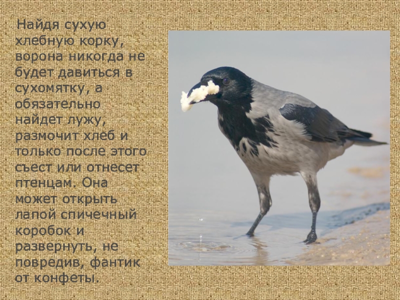 Слайд 21 Найдя сухую хлебную корку, ворона никогда не будет давиться в сухомятку,