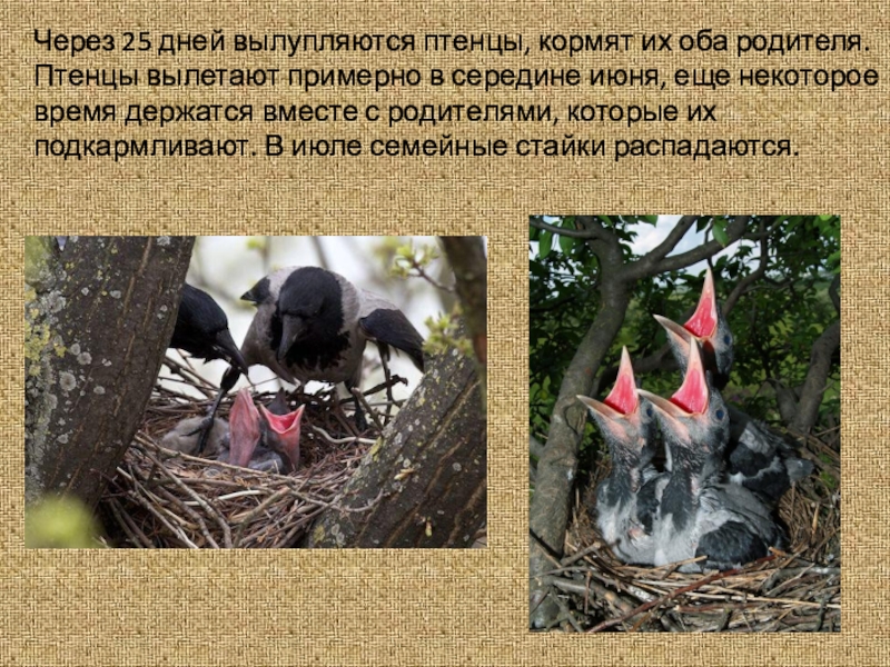 Слайд 16Через 25 дней вылупляются птенцы, кормят их оба родителя. Птенцы вылетают
