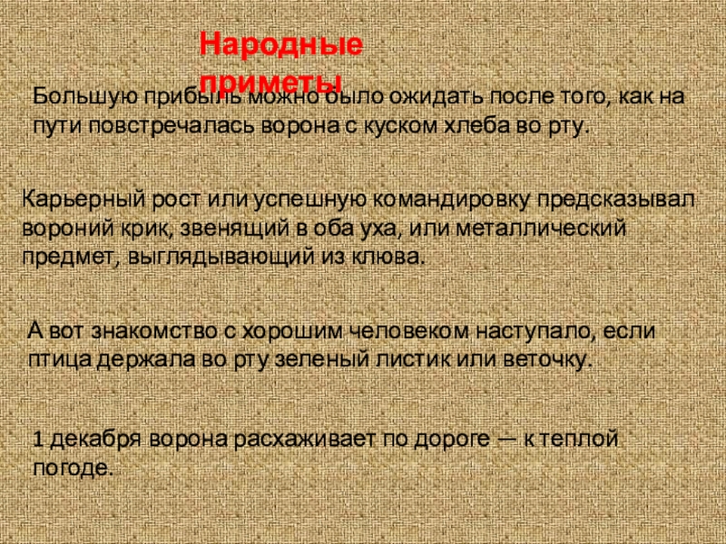 Карьерный рост или успешную командировку предсказывал вороний крик, звенящий в оба уха, или металлический предмет, выглядывающий из клюва.