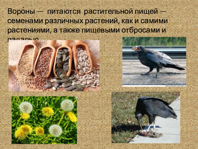 Слайд 12Воро́ны — питаются растительной пищей — семенами различных растений, как и самими растениями,