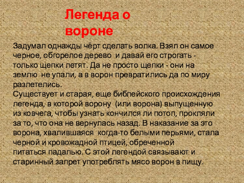 Существует и старая, еще библейского происхождения легенда, в которой ворону (или ворона) выпущенную из ковчега, чтобы узнать кончился ли потоп, прокляли за то, что она не вернулась назад. В наказание за это ворона, хвалившаяся когда-то белыми перьями, стала черной и кровожадной птицей, обреченной питаться падалью. С этой легендой связывают и старинный запрет употреблять мясо ворон в пищу.