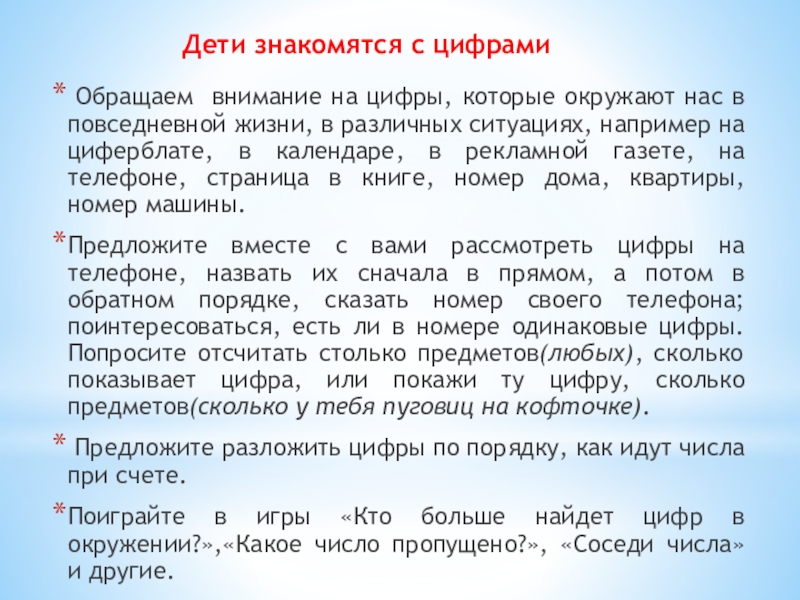 Поиграйте в игры «Кто больше найдет цифр в окружении?»,«Какое число пропущено?», «Соседи числа» и другие.