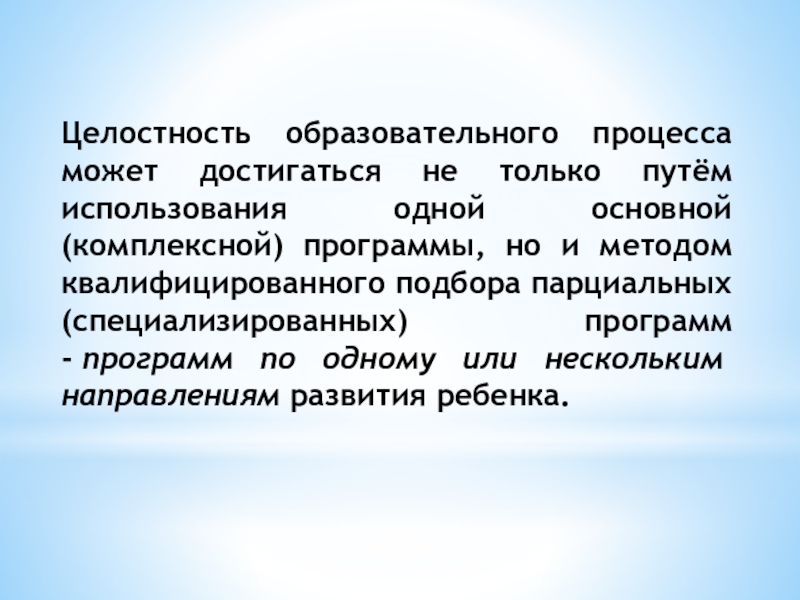 достигаться не только путём использования одной основной (комплексной) программы, но и методом квалифицированного подбора парциальных (специализированных) программ - программ по одному или нескольким направлениям развития ребенка.