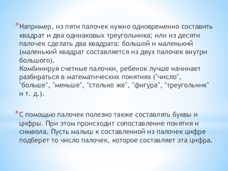 Комбинируя счетные палочки, ребенок лучше начинает разбираться в математических понятиях ("число", "больше", "меньше", "столько же", "фигура", "треугольник" и т. д.).