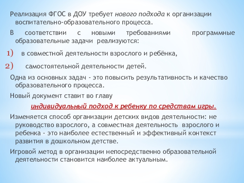 Изменяется способ организации детских видов деятельности: не руководство взрослого, а совместная деятельность взрослого и ребенка - это наиболее естественный и эффективный контекст развития в дошкольном детстве.