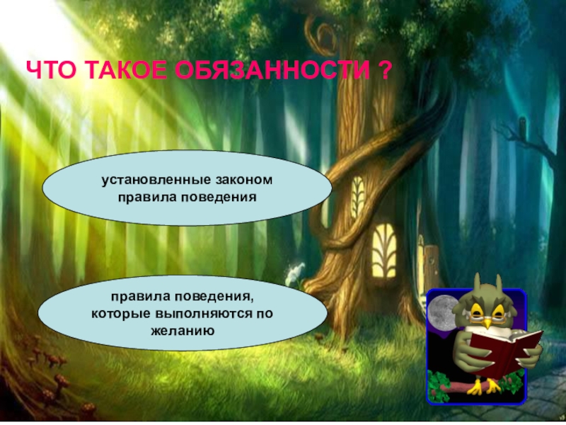 ЧТО ТАКОЕ ОБЯЗАННОСТИ ?установленные закономправила поведенияправила поведения, которые выполняются по желанию