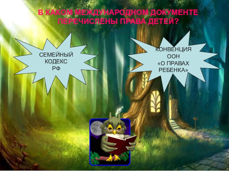 В КАКОМ МЕЖДУНАРОДНОМ ДОКУМЕНТЕ ПЕРЕЧИСЛЕНЫ ПРАВА ДЕТЕЙ?СЕМЕЙНЫЙ КОДЕКС РФКОНВЕНЦИЯ ООН«О ПРАВАХ РЕБЕНКА»