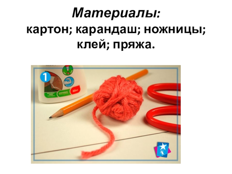Слайд 2Материалы: картон; карандаш; ножницы; клей; пряжа.