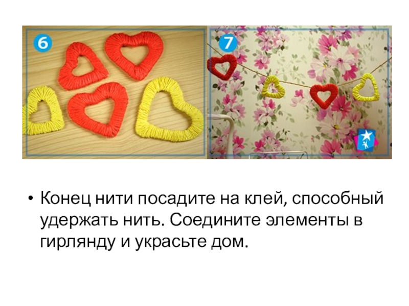 Слайд 5Конец нити посадите на клей, способный удержать нить. Соедините элементы в