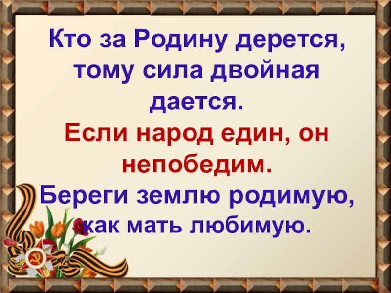 Слайд 7Кто за Родину дерется, тому сила двойная дается.