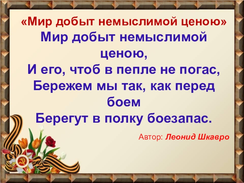 Слайд 5«Мир добыт немыслимой ценою» Мир добыт немыслимой ценою, И его, чтоб в пепле