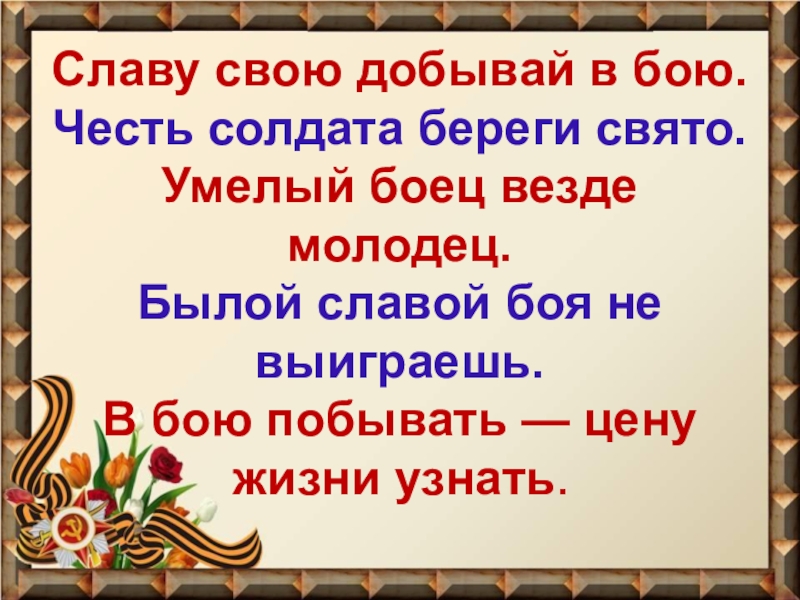 Славу свою добывай в бою.Честь солдата береги свято.Умелый боец везде молодец.Былой славой боя не выиграешь.В бою побывать