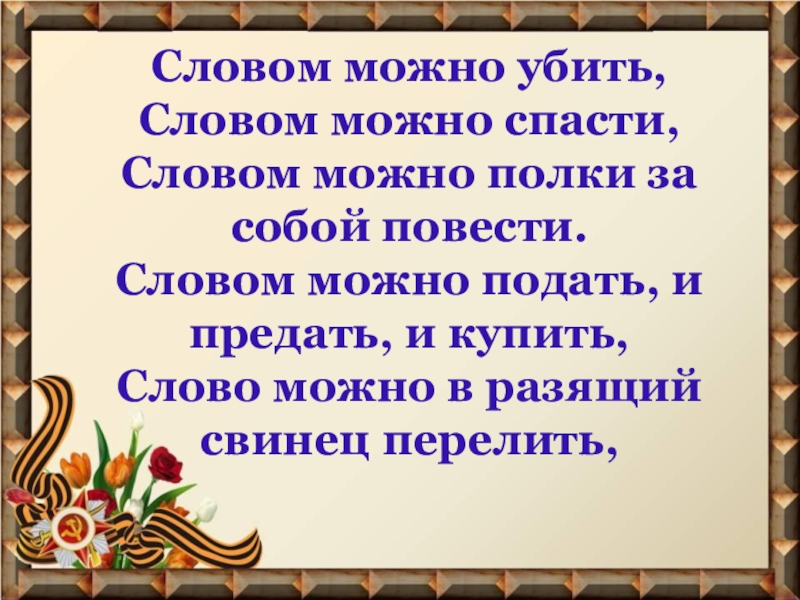 Слайд 12Словом можно убить, Словом можно спасти, Словом можно полки за собой повести. Словом можно