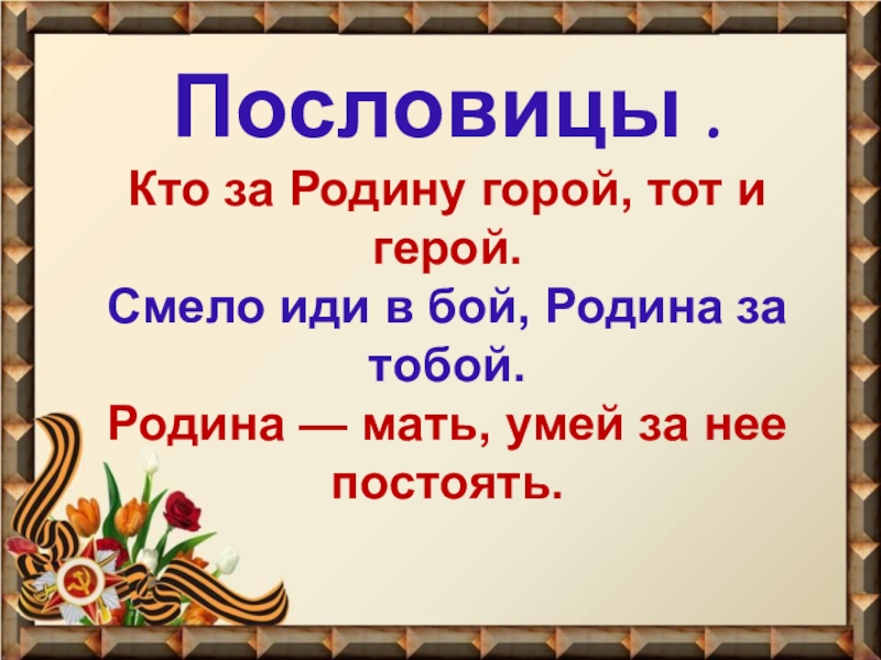 Пословицы .Кто за Родину горой, тот и герой.Смело иди в бой, Родина за тобой.Родина — мать, умей