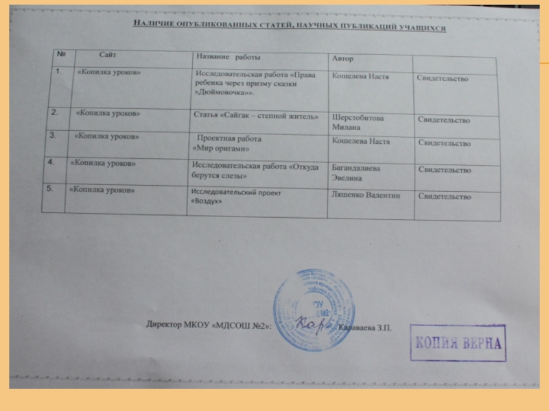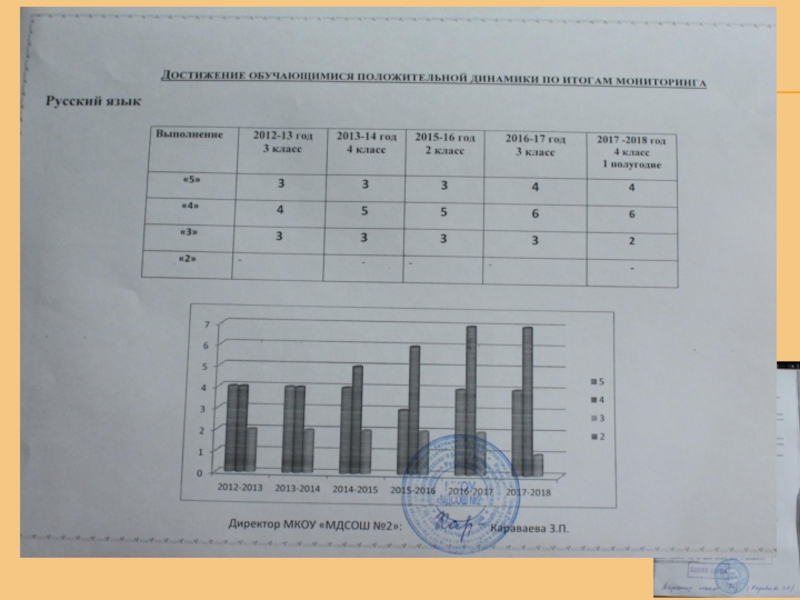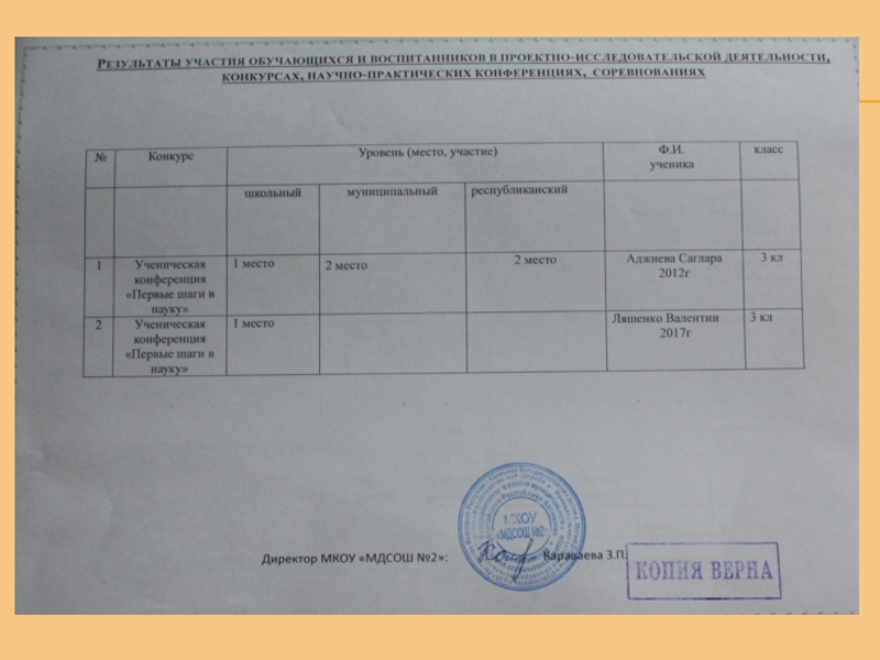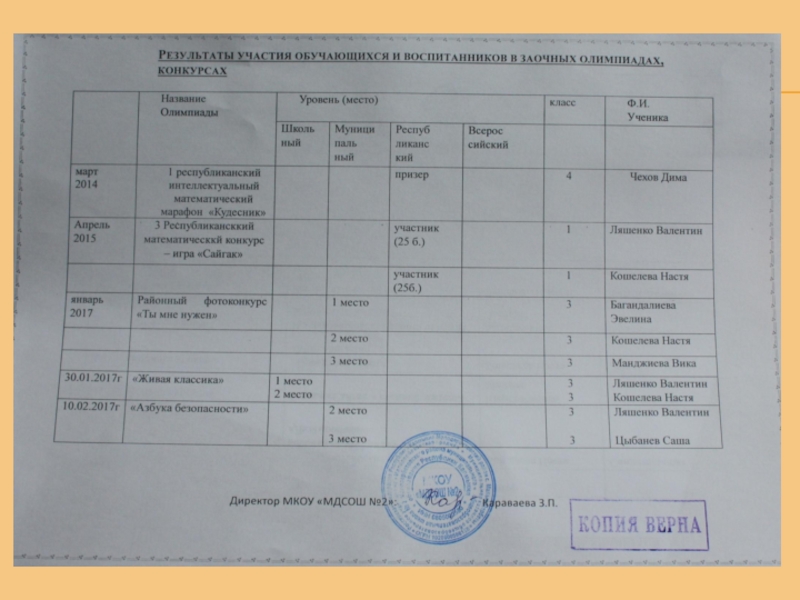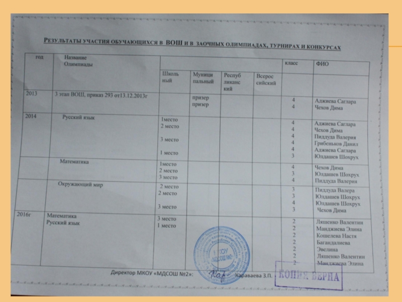 Награды: «Почетный работник общего образования РФ» - (2013г.); Грамота МО РК- (2005г);