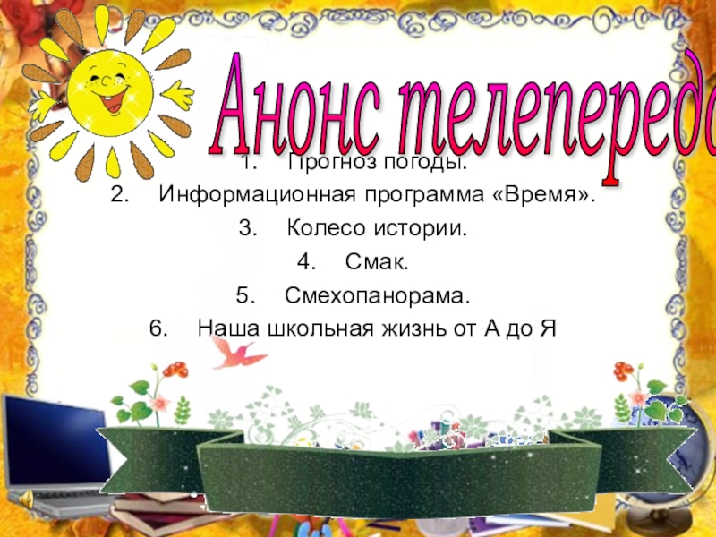 Прогноз погоды.Информационная программа «Время».Колесо истории.Смак.Смехопанорама.Наша школьная жизнь от А до ЯАнонс телепередач