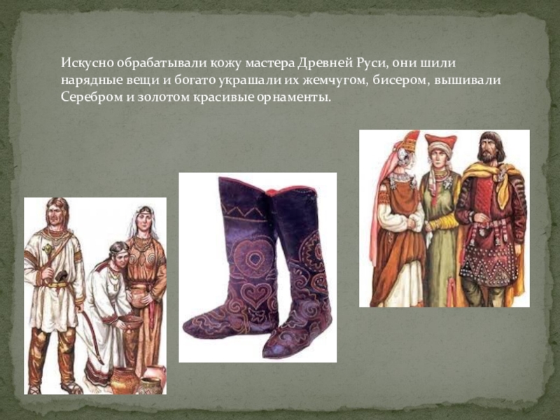 Искусно обрабатывали кожу мастера Древней Руси, они шилинарядные вещи и богато украшали их жемчугом, бисером, вышивалиСеребром и