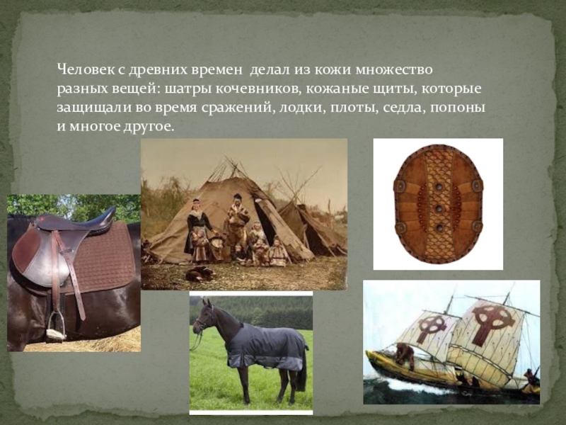 Человек с древних времен делал из кожи множестворазных вещей: шатры кочевников, кожаные щиты, которыезащищали во время сражений,