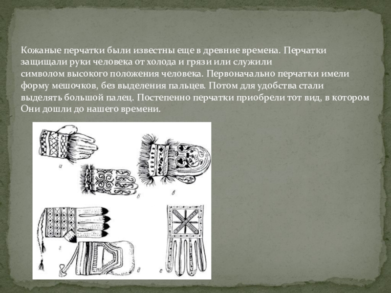 Слайд 8Кожаные перчатки были известны еще в древние времена. Перчатки