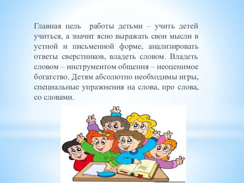 выражать свои мысли в устной и письменной форме, анализировать ответы сверстников, владеть словом. Владеть словом – инструментом общения – неоценимое богатство. Детям абсолютно необходимы игры, специальные упражнения на слова, про слова, со словами.