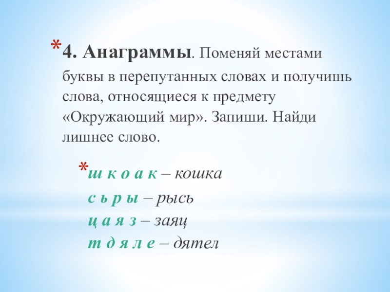 Слайд 174. Анаграммы. Поменяй местами буквы в перепутанных словах и получишь слова,