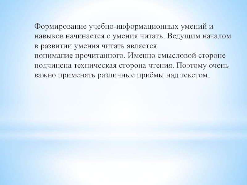 Слайд 20Формирование учебно-информационных умений и навыков начинается с умения читать. Ведущим началом