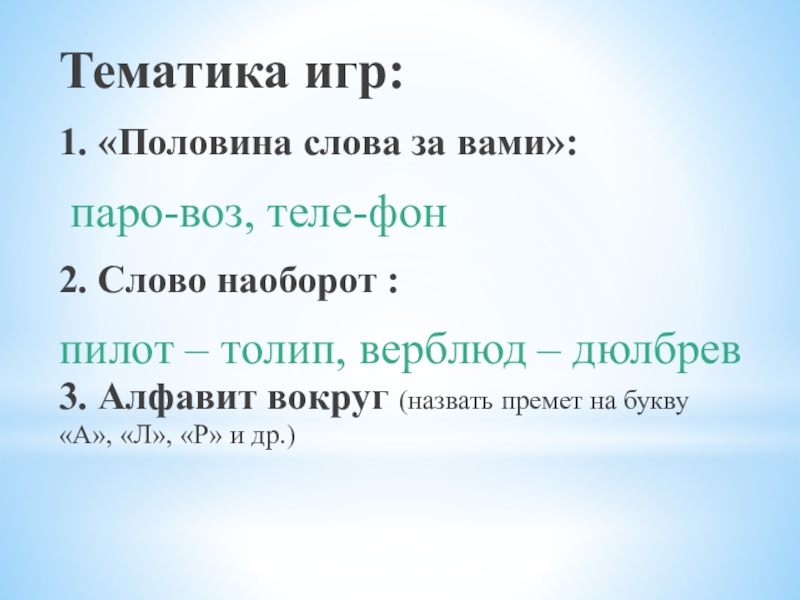 3. Алфавит вокруг (назвать премет на букву «А», «Л», «Р» и др.)