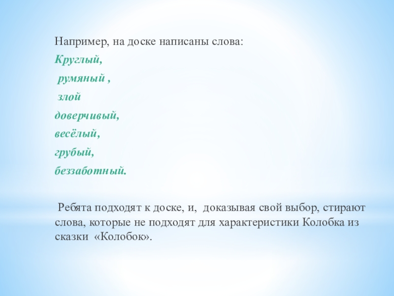 Ребята подходят к доске, и, доказывая свой выбор, стирают слова, которые не подходят для характеристики Колобка из сказки «Колобок».
