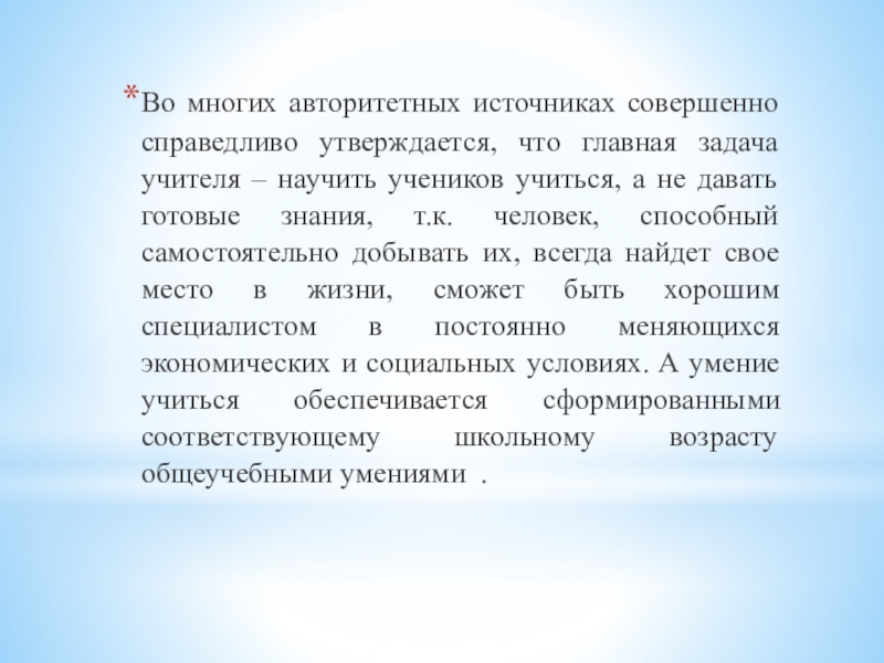 – научить учеников учиться, а не давать готовые знания, т.к. человек, способный самостоятельно добывать их, всегда найдет свое место в жизни, сможет быть хорошим специалистом в постоянно меняющихся экономических и социальных условиях. А умение учиться обеспечивается сформированными соответствующему школьному возрасту общеучебными умениями .