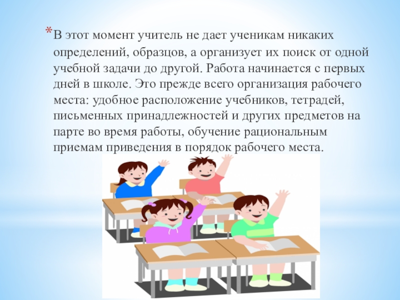 организует их поиск от одной учебной задачи до другой. Работа начинается с первых дней в школе. Это прежде всего организация рабочего места: удобное расположение учебников, тетрадей, письменных принадлежностей и других предметов на парте во время работы, обучение рациональным приемам приведения в порядок рабочего места.