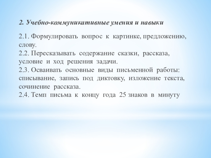 2.3. Осваивать основные виды письменной работы: списывание, запись под диктовку, изложение текста, сочинение рассказа.
