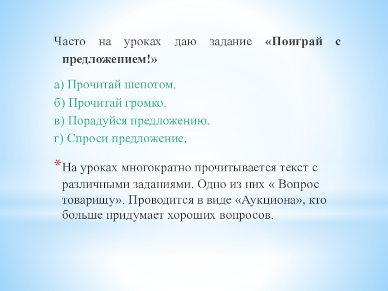 На уроках многократно прочитывается текст с различными заданиями. Одно из них « Вопрос товарищу». Проводится в виде «Аукциона», кто больше придумает хороших вопросов.