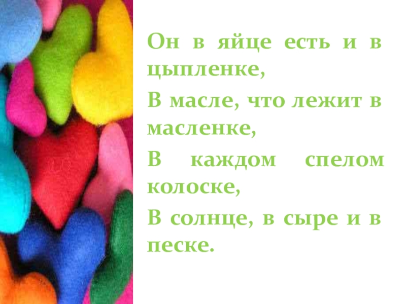Он в яйце есть и в цыпленке,В масле, что лежит в масленке,В каждом спелом колоске,В солнце, в сыре и в песке.
