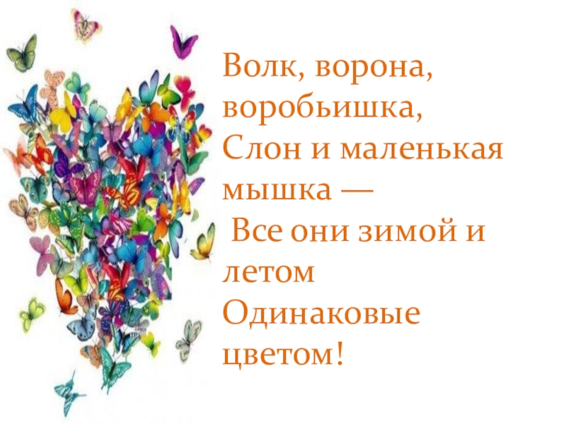 Волк, ворона, воробьишка, Слон и маленькая мышка —  Все они зимой и летом Одинаковые цветом!