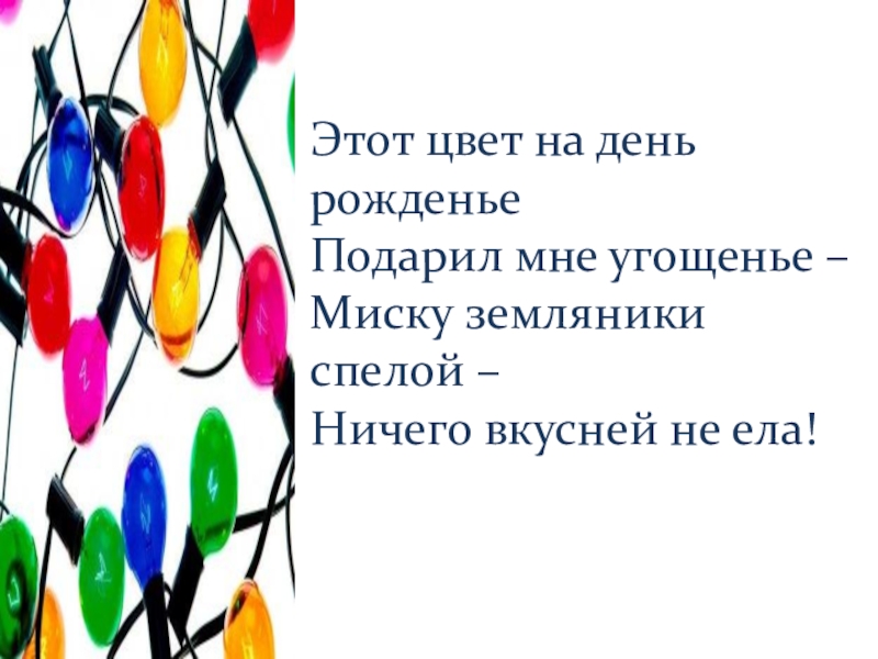 Слайд 12Этот цвет на день рожденье Подарил мне угощенье – Миску земляники спелой – Ничего