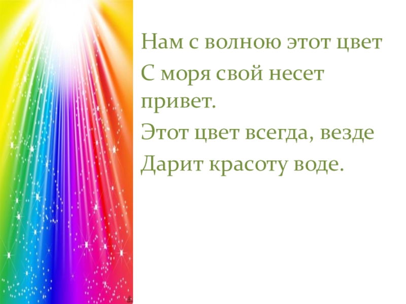 Нам с волною этот цветС моря свой несет привет.Этот цвет всегда, вездеДарит красоту воде.