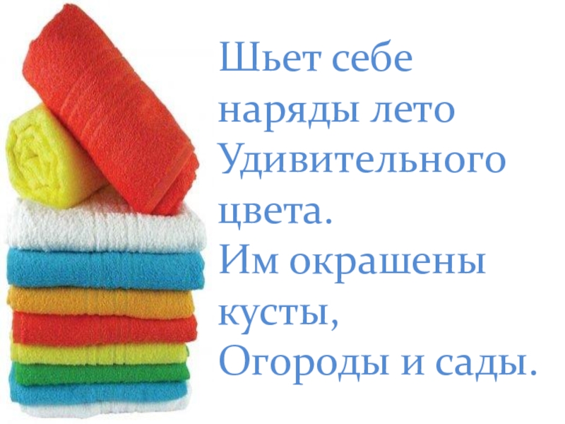 Слайд 4Шьет себе наряды лето Удивительного цвета. Им окрашены кусты, Огороды и сады.