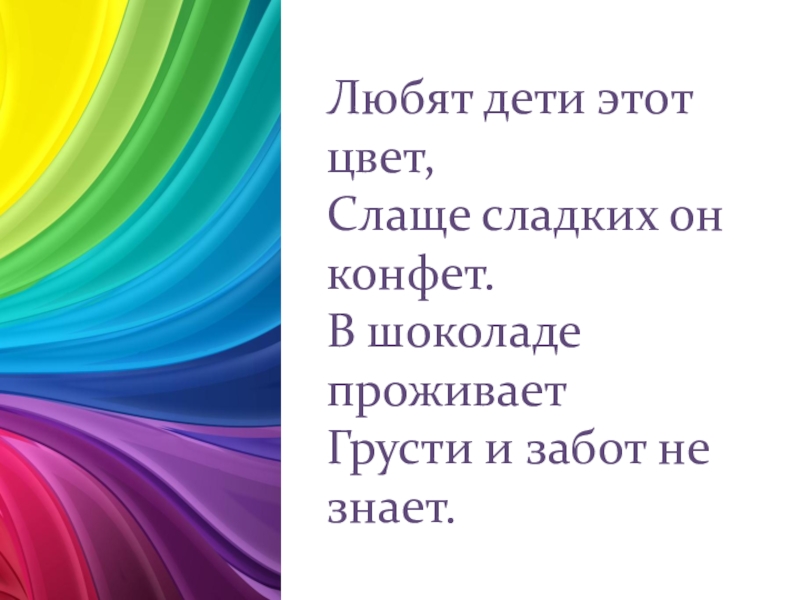 Слайд 17Любят дети этот цвет, Слаще сладких он конфет. В шоколаде проживает Грусти и забот