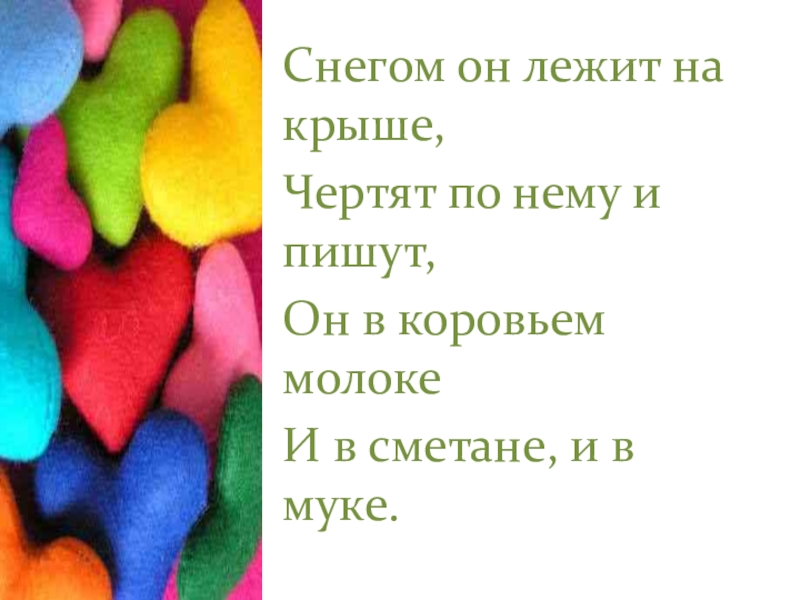 Снегом он лежит на крыше,Чертят по нему и пишут,Он в коровьем молокеИ в сметане, и в муке.