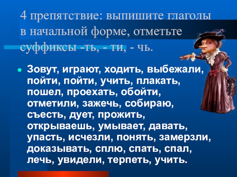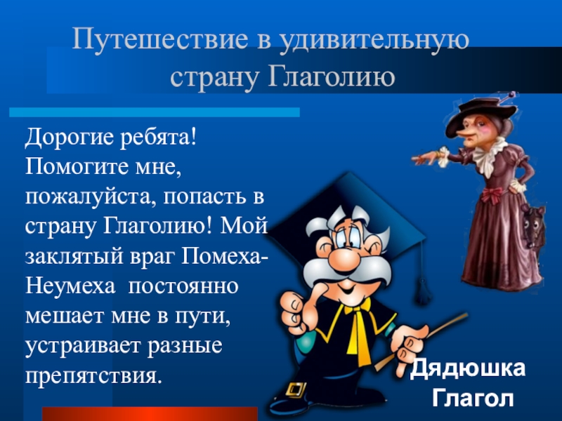 Дорогие ребята! Помогите мне, пожалуйста, попасть в страну Глаголию! Мой заклятый враг Помеха-Неумеха постоянно мешает мне в пути, устраивает разные препятствия.