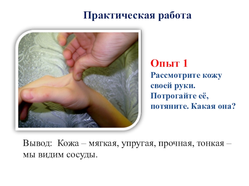 Вывод: Кожа – мягкая, упругая, прочная, тонкая – мы видим сосуды.