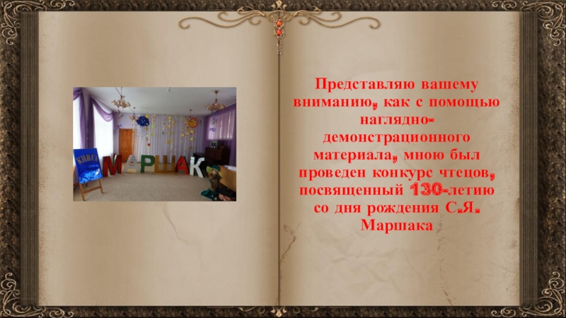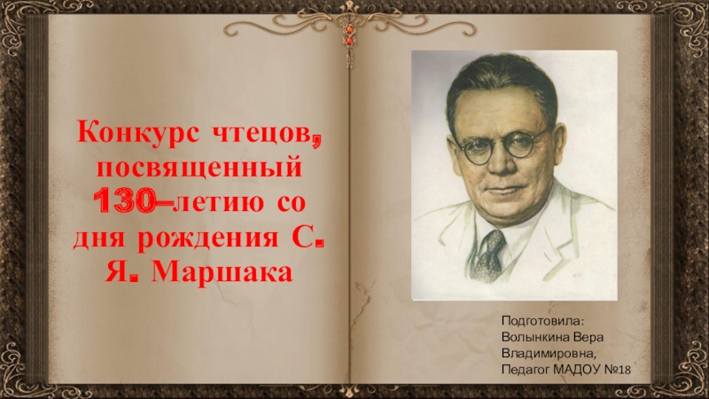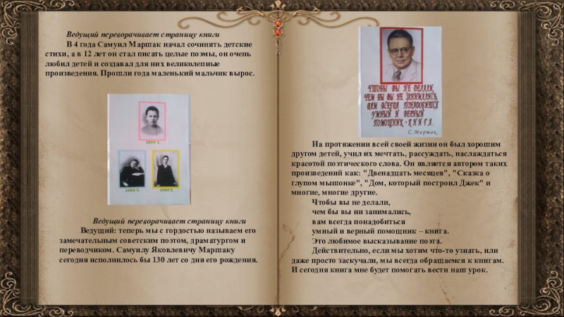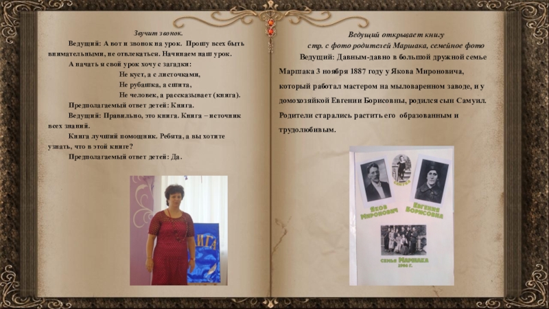 Ведущий: Давным-давно в большой дружной семье Маршака 3 ноября 1887 году у Якова Мироновича, который работал мастером на мыловаренном заводе, и у домохозяйкой Евгении Борисовны, родился сын Самуил. Родители старались растить его образованным и трудолюбивым.