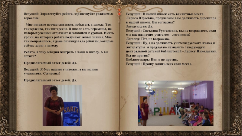 Ведущий: Ну, а на должность учителя русского языка и литературы я предлагаю назначить заведующую центральной детской библиотекой –Ларису Николаевну. Вы не против?